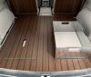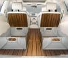 Aluminium-Elemente setzen im Innenraum zusätzliche Akzente, sie finden sich beispielsweise an den Lufteinlassdüsen und den Türöffnern. Modische Akzente setzen außerdem ein nussbrauner Keder im Sitz sowie eine feine braune Biese in der Schalttafel und an der Tür. Teile der Armauflagen, der Schaltknauf und die inneren Einstiegsleisten bestehen aus amerikanischem Nussbaumholzfurnier, in dem schmale Streifen aus dunklem geräuchertem Eichenholz eingebettet sind – ein weiterer Bezug zum Bootsbau. Die gleiche Kombination dient auch als Boden für den Gepäckraum mit zwei integrierten Klappboxen. Das Holz wird nicht lackiert, sondern gewachst – seine Poren bleiben offen, was einen ganz individuellen haptischen Charme und seidigen Glanz vermittelt.